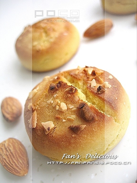 5 面团冷藏变硬后,从冰箱取出切成圆片或用模具刻出自己喜爱的形状 6 杏仁切碎撒在面片上,排放在铺了油纸的烤盘上,高火3分钟再高火2分钟就好咯