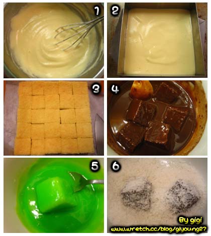 製作:1、將牛奶加熱,把切碎的朱古力加入拌溶,加入牛油攪溶成朱古力漿;2. 將切好的蛋糕,放入朱古力漿/草莓/藍莓醬/班蘭漿內沾滿,放入椰茸內碌勻即成,最後放進冰箱內。(班蘭漿製作:將牛奶與班蘭香油拌勻加熱,倒入白朱古力內攪拌至完全溶解即可)