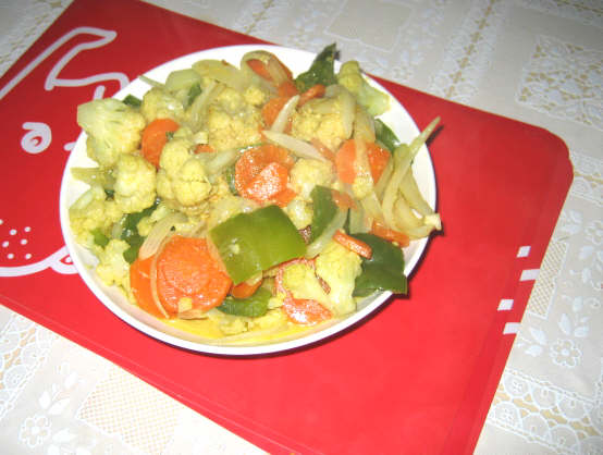 2 烧热油将蔬菜翻炒1,2分钟,加酱料,加一点点水,再炒3,4分钟到熟 做好了,很简单吧,其实在家里也可以做这种有异国情调的小菜。自己在家,没人的时候就可以试试,半个小时搞定~~
