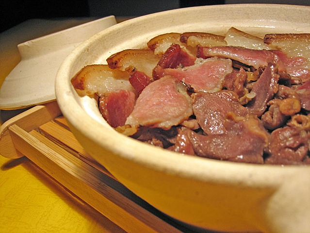 今天晚上做了海星汤&煲仔饭,一个人吃,好撑! 煲仔饭 材料:鸭肾;同事送的湖南腊肉 材料的处理:鸭肾改刀,用花生油,麻油,盐,糖,白胡椒粉,酱油等腌制约20分钟;腊肉切片。 步骤:冷水下米,水开后调中火,待水煮少大部分,可以看到冒着泡泡的孔孔后,把鸭肾&腊肉一起放下,盖上盖子,调小火,慢慢焖上10分钟。
