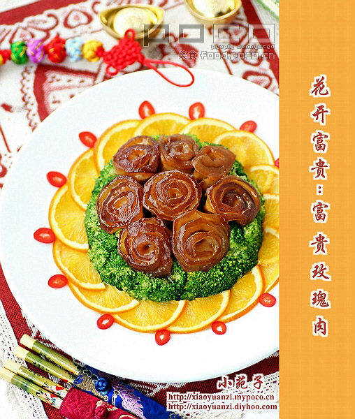 富贵玫瑰肉的构思是参考著名的御膳菜“万字扣肉”的做法,把正方形的肉块卷切成一朵 “玫瑰花”,再以扣肉的烹调方式来制作,造型美观,色泽艳丽,入口香醇!