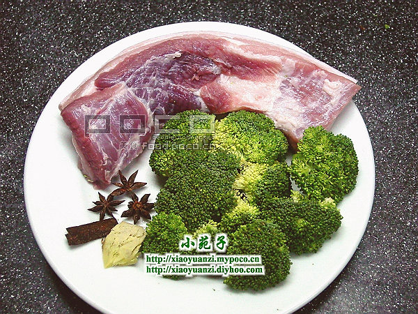 材料:带皮五花肉、西兰花、八角、桂皮、姜片
