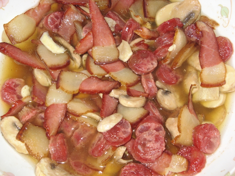今天太饿了,于是乎没能陪范大厨回家,就在食堂解决了~范大厨毅然独行回家做饭,不过没有做他昨天给我说的拿手绝活,倒是自己做起了创意菜,回家来看到范大厨正吃的津津有味,尝了一下味道果然不错,香味始终停留在舌尖,到现在还在回味呢!范大厨说名字没想好,我就暂时替他取其名为腊肠炖蘑菇吧,原来应该是蘑菇腊肉和香肠,腊肉和香肠是他从湖南家里带来的,