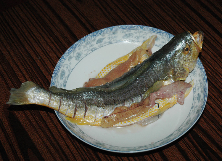 两条大黄鱼在冰箱里躺了几个月了,不吃简直就是浪费。正好这两天吃肉吃厌了,拿出大黄鱼尝试清蒸一把。 让人奇怪的是大黄鱼肚子里干净得出奇,除了鱼卵外没有别的东西,连肠都没见,我用刀开肚前鱼身可是完好无损啊!真不知大黄鱼是怎么消化东西的。不管那么多了,这样还省事,鱼肚子里稍微清洗一下,去鱼腮、刮鱼鳞,就算打整完毕。 先用刀在鱼身上切几刀,然后里里外外摸上盐腌半小时。