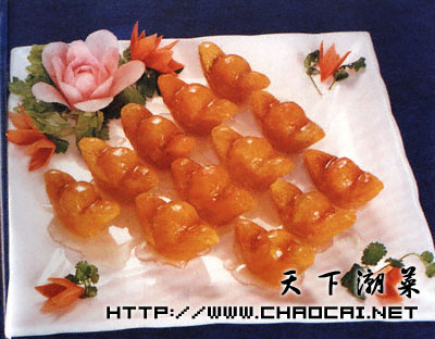 ,就必须用猛火熬3分钟,使糖浆升温,保持饱和度。这时番薯受糖浆内的热度所迫,本身的水分泌出,形成水蒸气,使每件番薯的表面逐步形成带有胶粘度的硬糖表皮。这时便转为慢火熬7分钟,经过慢火,使番薯逐步受热,完全熟透,便可逐件捞起,盛摆在餐盘上即成。