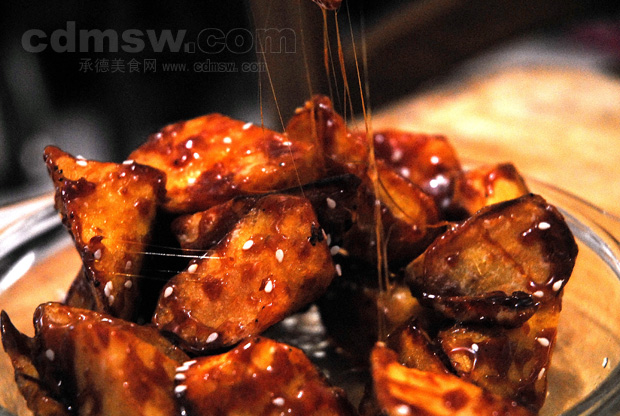 1.首先,把红薯洗净,去皮切成滚刀块,略干后备用. 2.锅下油,等油热起来的时候,把红薯放下去炸成8成熟,也就是外面的有点金黄,还没有变焦的时候.捞出备用. 3.锅内留少量的水,也可以放油,放入三勺的白糖,不断的炒,变成有点棕色了就行了,(注意千万不能太过了,要不就变苦了,不好吃了)放入红薯翻炒,直到搅拌一般均匀就可以装盘了.很简单的,要不要试试...很好吃,也很好看的....嘿嘿..