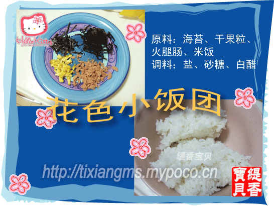 现在是新米上市的时节了,平时不大爱吃饭的我也觉得最近连盒饭里的米饭都格外的好吃起来。 过中秋节,单位里发了好大一包米。煮的饭也非常的好吃,所以都忍不住要多吃一点了。 今天在家收拾我做菜的小东西,看见有一个做饭团的小模具还没有用过呢,于是就用了家里现有的材料,做了几个小饭团。