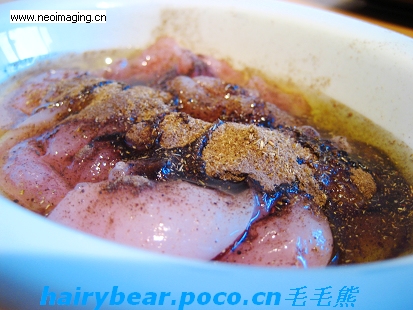 6,把鸡肉丁用五香粉,橄榄油,糖,胡椒粉,花椒油拌匀,腌制5个钟头左右。