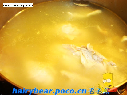 14熬几个钟头的鸡汤也好拉,上边漂拉一层油,这层油是保持肉汤的温度。可别倒掉啦!