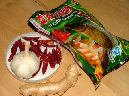 原料有:超市买的酸菜鱼调料一包,辣椒干若干,蒜瓣若干,姜片若干