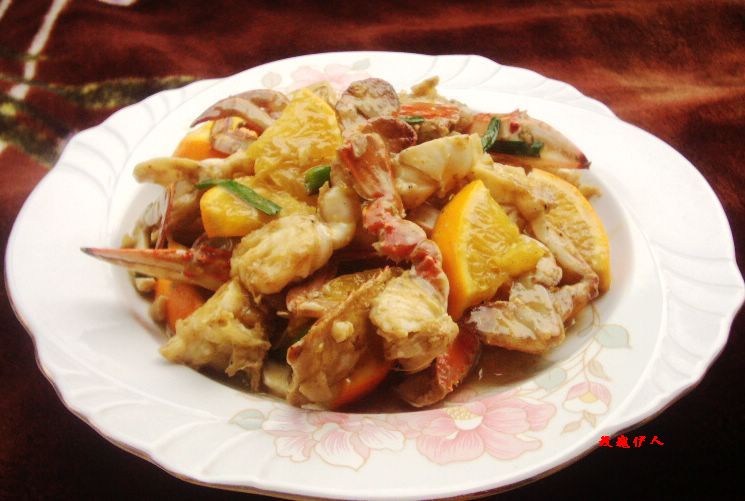鲜橙半个榨汁,半个切块.蟹拍上面粉,锅里放油,丢入拍碎的大蒜,放入蟹煎一会,加入盐,鸡精,白糖,白胡椒粉,料酒调味,最后倒入一点橙汁再放入鲜橙翻炒.海蟹中融入橙香升华出不同的滋味来.