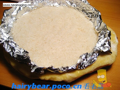 7.大米装在锡纸里,压在面皮上,再放进烤炉烤