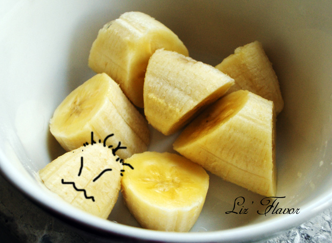 某天某同事过生日,去了“公主蜜语”,餐牌首页是香橙梳夫哩,简介为——最难做的甜品。心想——吹牛~~~~~周末在家,辛勤地做送人的贺年礼盒,想想还是要为自己做个什么吧,那就做那所谓最难做的梳夫哩吧~正好桌上还要几根熟透的香蕉,就一起扔进去吧~香蕉一根,蛋黄1个,蛋白2个,糖25g,香草精1/2小匙,1.香蕉切块放入容器2.蛋黄加入糖,香草精,打至发白3.蛋白打至硬性发泡,加入蛋黄混合,倒入容器4.200度烤20min香蕉切块