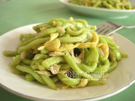 用鸡蛋皮和小白虾皮炒波菜汁面条,味道太香了,面条口感很Q...... (温馨提示:做面条的面团要比一般的面团要硬;擀面团时要撒些手粉;炒面条香,用来做汤面也好味)