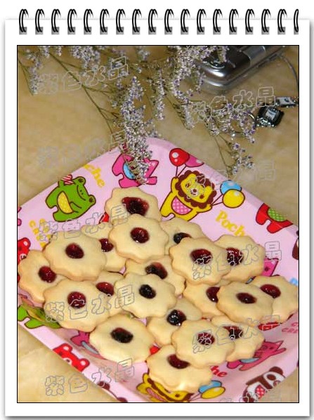 4.成型后的饼干用一小圆柱体(偶用的筷子)在中间搌一个小窝,浇上果酱。