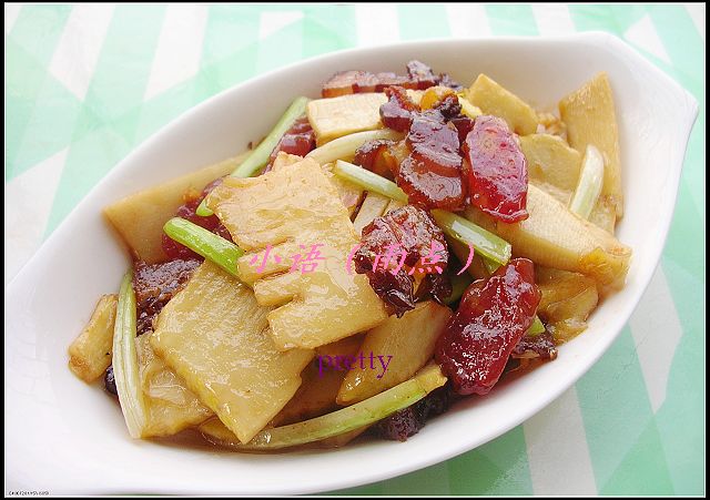 材料:笋、腊肠、腊肉、芹菜、蒜头 调味料:盐、糖、鸡汁、蚝油 做法:1。笋去壳飞水泡半天再切片,芹菜切幼条、腊肠、腊肉切片,蒜头拍碎。 2。起锅爆香蒜头放腊肠、腊肉炒香,再放已切好的笋片下去炒到快熟时下芹菜炒匀。 3。最后放上调味料炒匀上碟。