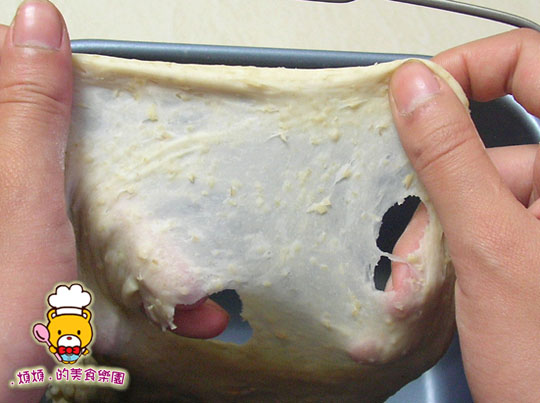 黄油25克 做法: ![]() 恩.因为里面加了全麦粉,全麦粉会降低面粉筋度~所以不需要搅拌至完全扩张阶段~~ 搅拌到能拉出薄膜状,但是破的洞的边缘成齿状就行了~~~ ![]()