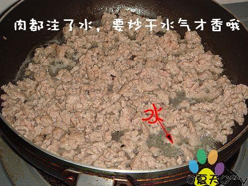 肉酱要炒得好吃可不是随便的事情~记得第一次自己做~炒出来总是没有妈妈的香~原因就是我炒得不够干,所以肉不香啊~平底锅不加油,热了锅之后把肉放下去,打散~不要急,慢慢等他水分炒干,出油才加调味料~