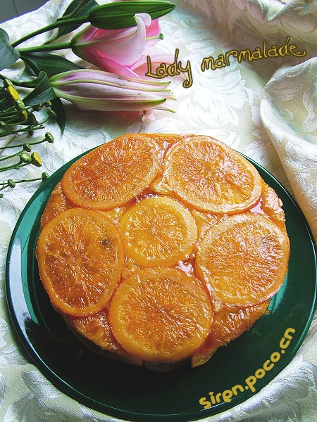 Marmalade polenta cakeMarmalade是特指用橙或柠檬制成的果酱。这里并没有用到现成的果酱,却有类似的效果。第一次在书上看到这款蛋糕,我马上联想到了红磨坊的主题曲,四个性感的美女穿着惹火的短装,载歌载舞。嗯,这款蛋糕,就叫它Lady marmalade吧。材料:糖180克,水310克,橙子(中等,约240克),切薄片,柠檬(大,约180克),切薄片;牛油125克,糖160克,鸡蛋3个,杏仁粉60克,低粉75克,自发粉75克,polenta120克(我用的是杏仁麦片),柠檬皮1tbs,酸奶油120克,柠檬汁60ml。用乳化法。175度左右烘烤1小时15分钟(这里需根据自己烤箱的情况调整时间,避免烘烤过度,我烤了1个小时)