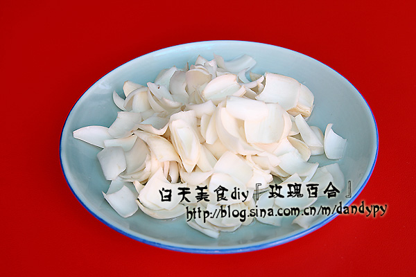在一家餐厅吃过两次这个菜,觉得很好吃也挺好做,就自己鼓捣了一下。我做得很简单,口味可以根据自己的喜好胡乱的调整。我用的所有东西如下:百合、鲜橙多、蜂蜜、猕猴桃、玫瑰花。很简单好找的材料吧。