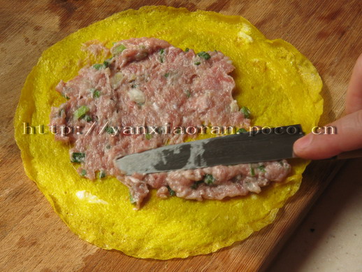 要摊得均匀哦,不然很容易糊掉 5、蛋皮烙好后,将蛋皮平放在菜板上,然后将准备好的肉陷儿均匀地抹在蛋皮上。