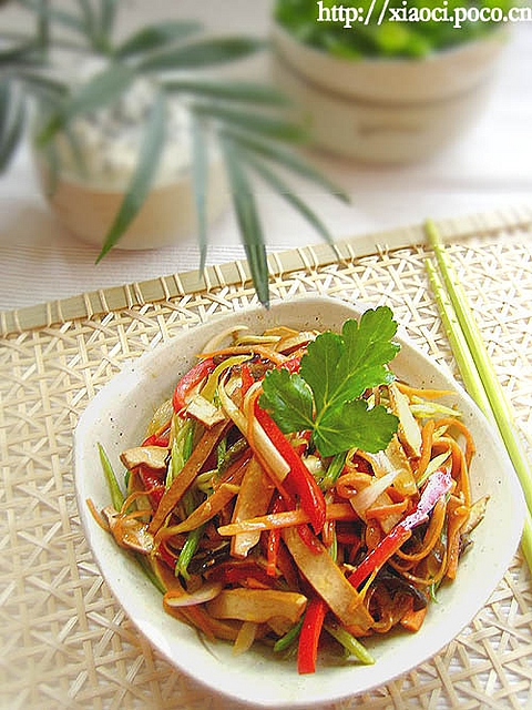 今天这道菜的主料是豆腐干,它的营养价值并不低于牛奶,且具有清热、润燥、生津、解毒、补中、宽肠、降浊等功能。因此,爱吃豆腐干的人,皮肤一般比较嫩滑、晶莹,很少生暗疮,肠胃功能亦很正常。由此可见,豆腐干还是美容良品之一。 主料:豆腐干,胡萝卜,洋葱,红椒,绿椒,黑木耳,