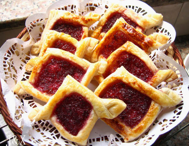 玫瑰花糖可以在超市买到,如果买不到可以把玫瑰花糖换成蓝莓酱、草莓酱或是各种自己喜爱的果酱都可以。 ![]() jxxiaoxia<>20070323144250.jpg 酥皮擀平,切成方形对叠成三角形