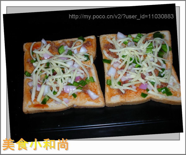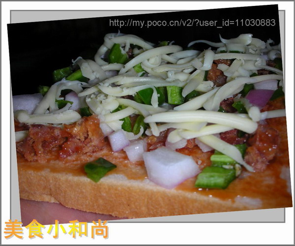 />撒上香肠粒、青椒粒、洋葱粒、芝士条