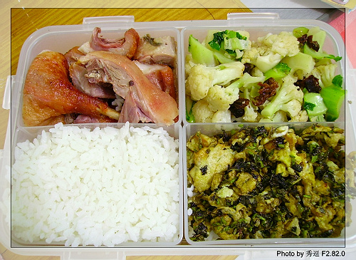 爱心盒饭52:北京烤鸭+腊肉炒花菜+香椿炒蛋