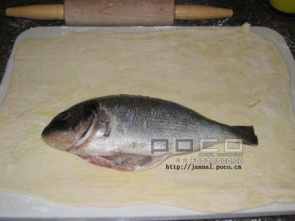 做法: 1。 先把鱼洗净,抹些盐,柠蒙胡椒粉,(有兴趣的朋友可以放些松子在鱼肚里,去腥,而且更有香气,我没放,是后来才想到的) 2。 做一张大酥皮 3。 用酥皮把鱼包起来。 4。 烤箱400F,烤20-30分钟(视烤箱而定)。酥皮金黄,松起即可。(我把鱼尾给烤焦了一点点) 特点:外表酥香,里面嫩滑。