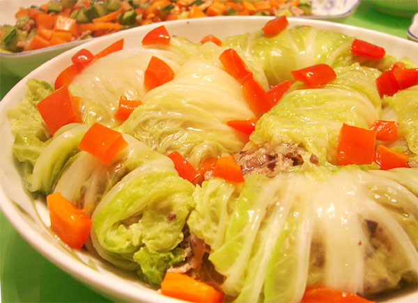 第一位摆酒结婚的舍友,结婚前的最后一次宿舍聚会。要求只有一条:无论多晚来都可以,就是不能夜不归宿!! 大家一起做了许多菜。这是从梅子JJ那里学来的白菜肉卷,很清淡好吃的菜:) 做法也很简单:将白菜叶子烫一下取出,将喜欢的肉馅卷在里面,我加了香菇跟虾米,卷好后摆在盘子里用微波炉两面各丁两三分钟,用红椒粒加牛肉汤、蚝油、淀粉勾芡浇上去即可。