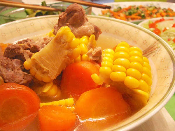 ![]() 玉米胡萝卜碎排骨汤~ 这是舍友做的,超赞~! 在菜市买的碎排骨,高压锅压得很软,简直是入口即化~ 加上玉米跟胡萝卜的香甜,真是美味啊~:D