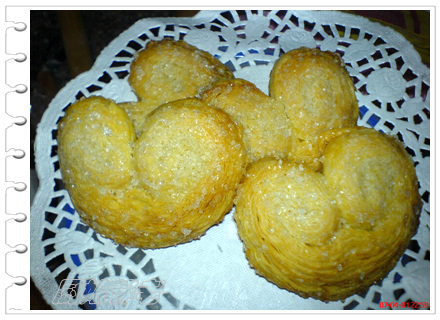 ![]() 说实在的做这种点心太多油了,烤的时候,盘里的油吱吱直冒,象油炸的一样,好在老公现场没看到,拿出来一口吃了两个半。照片照得不齐全,还不是很习惯一面做点心,一边拍照,有时做完下一步发觉忘拍了,很佩服博客上的JM们,上个完整的图片和方子不容易哦。