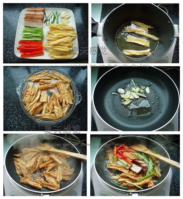 2 炒锅烧热放油,7成热时放入腐竹炸成金*,捞出沥干油放入清水中5分钟 3 锅留底油烧4成热,放入葱姜蒜爆香,加腐竹,调入酱油,盐,糖,蚝油,高汤翻炒均匀 4 加入青红辣椒和叉烧炒匀即可