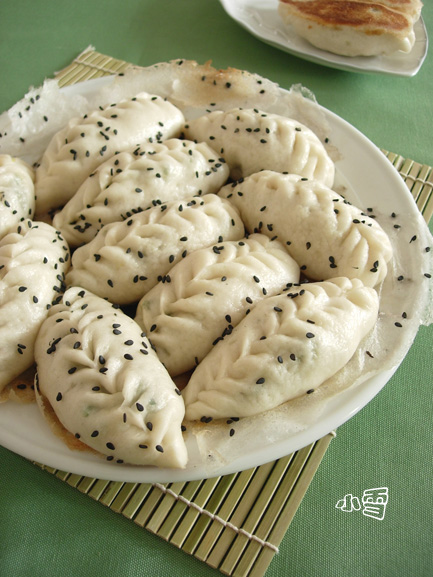 ![]() 材料:发面团、韭菜、鸡蛋和黑芝麻 做法:将醒发好的面团,揉后搓成长条揪成小剂子,用擀面杖擀成面皮;取一面皮包入小韭鸡蛋馅(鸡蛋放点盐加点温水打散