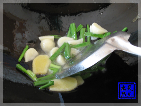 步骤二:热油起锅,把葱蒜下锅爆香,放入排骨煎香,再放入调味品和八角桂皮,加清水炖制一个小时。