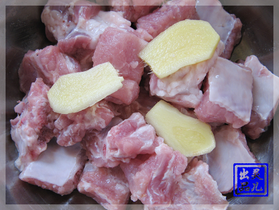 步骤一:肉排处理好,加入姜片,料酒腌制30分钟,后进行灼水再沥干水份。