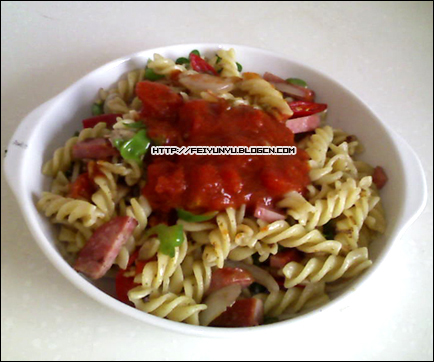 大杂烩, 有:青椒,红椒,香菇,洋葱,火腿。