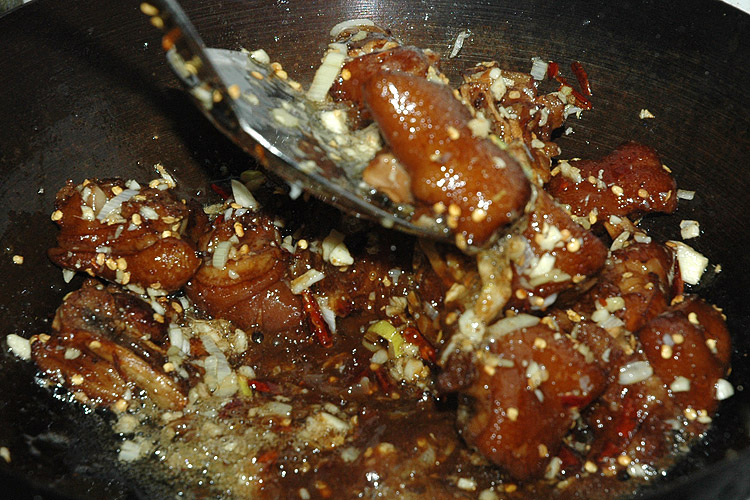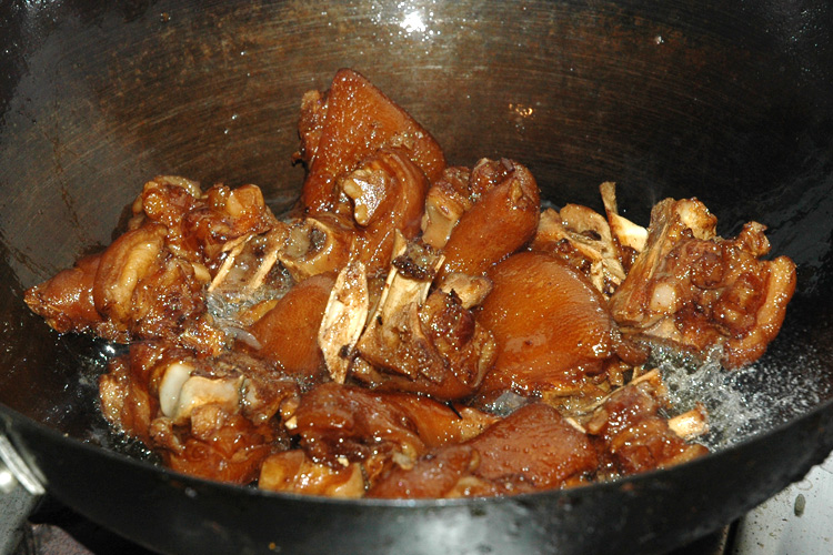 7、随后放入葱姜蒜和干辣椒,翻炒,并倒入刚煮猪蹄剩下的浓汤,直到将水烧干。