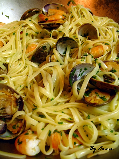 热锅下蒜蓉黑胡椒粒,爆香,下海鲜爆炒几下,赞白葡萄酒一杯,盐适量,盖盖,看见贝壳全开了就加入煮8成熟的意大利面和荷兰芹,拌匀上碟。