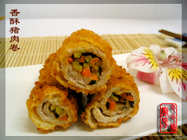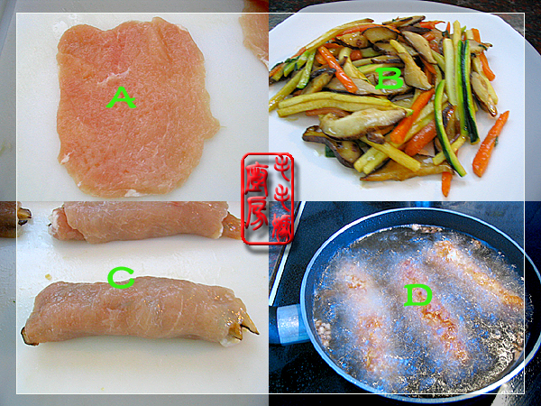 上保鲜纸,用木锤或刀背将肉片锤松(图A),然后加上2料拌匀腌30分钟。炒锅放橄榄油1大匙置炉上开大中火,放入葱花炒香,放入4和5料炒半分钟,然后加入剩余的7料兜匀,放下葫芦瓜丝翻炒几下出锅,冷凉做馅(图B)。每片肉包上1/6的馅料,卷成卷(图C)。小炒锅内放菜籽油2杯置炉上,开大中火,油热后,将肉卷放入3料拌成的蛋糊中裹匀,再沾上一层面包糠。放入热油里炸成金*捞出沥油(图D)。