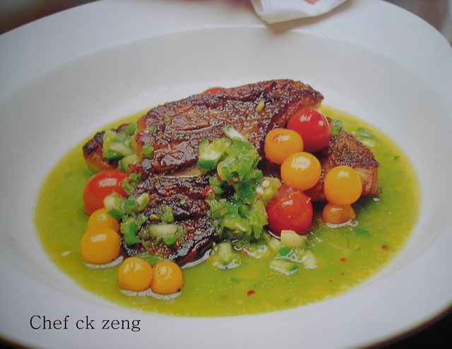 Tilefish in a sungold tomato and cool cucumber gazpacho