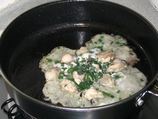 海蛎煎到两面微黄,将淀粉水(记得里面加少许的盐和鸡精调味)与青蒜末儿倒入锅中,只要薄薄的一层即可,约一分钟后,锅边结起透明白色的粉皮儿,这时就可以将调了味的蛋液倒入锅中了.