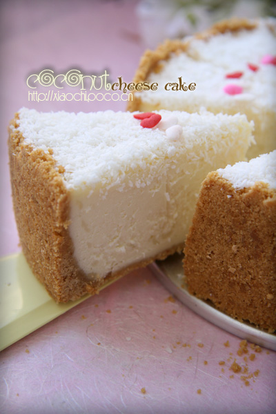 冰箱里的一块cream cheese已经在那呆了很久了,最近没什么朋友生日,没动力做,眼看着这块美味的cheese快要过期了,突然想起家里有个除了爱吃肉肉以外还超爱cheese cake的小白鼠,好吧,趁着放假有空,就让他爽一次,独享一个大大的cheese cake~看看家里有的材料,刚好可以做个椰香芝士蛋糕!方子来自FION,请原谅我的懒惰,我又直接从她的SPACE COPY过来了。。。