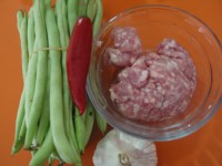 材料:肉末,四季豆,蒜. 调料:生粉,盐,生抽,老抽,植物油; 肉末加生粉和生抽调下味,四季豆翟好后掰段在热水里过一下,比较容易煮熟. 锅里加油放肉末进去炒,盛出待用.接着放蒜爆香再放四季豆,生抽,老抽翻炒后转小火加盖子焖.(不用加水的),加少许盐调味.差不多的时候再放入肉末即可.