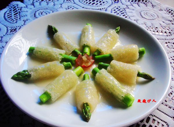 水开后放点盐和油放入竹荪,芦笋飞水后,竹荪包住芦笋,用肉骨高汤喂熟.摆盘,剩下的高汤勾薄芡浇上,即可.