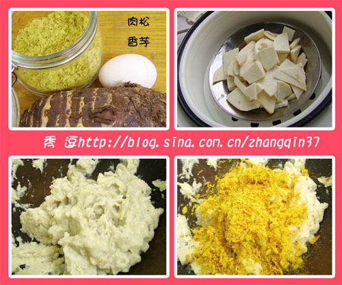 肉松是上个星期做的,以前写过做法的,有兴趣的看这里: http://blog.sina.com.cn/u/4a9f8b09010006is 香芋切成片,放在蒸格里,煮饭的时候顺便就蒸好了。 将蒸好的香芋压成芋泥,再加肉松,再加米饭拌好,就可以了,然后捏成自己喜欢的形状,我用的是按压式月饼模。 [1] [2] [3] 第2页、共3页