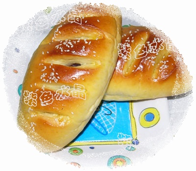 2.取出发好的面团,分割成小团,滚圆松弛10分钟。 3.面团擀开,包入豆沙馅,然后整成橄榄形,再放入湿润温暖的地方进行第2次发酵。 4.面团上轻轻地划上几刀后刷上蛋液。 5.烤箱预热170度,中下层18分钟。