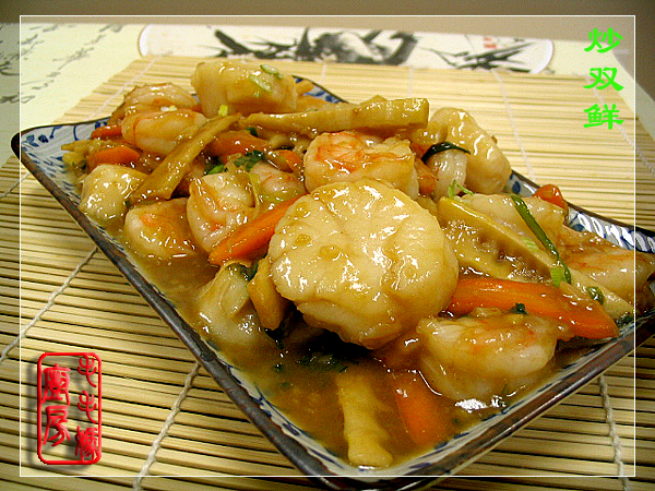 白胡椒粉1/8茶匙。4:绍酒1大匙,李锦记旧庄特级蚝油1.5大匙,糖1茶匙,白胡椒粉1/8茶匙,水2大匙。5:菜油3大匙,蒜蓉1大匙,姜末2茶匙,葱花1大匙。6:小胡萝卜(Baby carrots)5根30克切片,冰冻笋1条40克,飞水切片。7:香油2茶匙。做法:带子和虾放一大碗内加3料拌匀,腌30分钟。炒锅放菜油2大匙置炉上开大中火,放入带子和虾炒至8成熟捞出。原炒锅放菜油1大匙置炉上开大中火,放入胡萝卜片和笋片翻炒几下,接着放入蒜蓉,姜末,葱花同炒出香后,加所有4料炒匀至汁干。然后放下炒好的带子和虾翻炒几下,再淋下香油兜匀出锅。