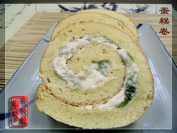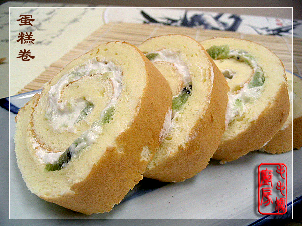 一层打发的鲜奶油及奇异果的混合馅,留空约1/5,再将蛋糕卷起,盖上保鲜膜,放冰箱约30分钟定型后切片食用。